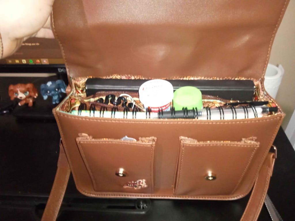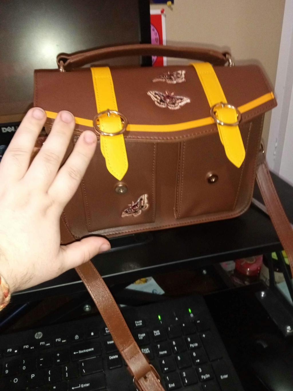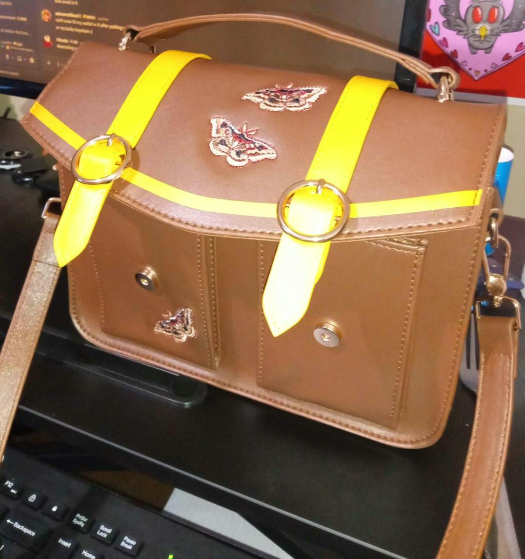 A small moth themed messenger style bag.