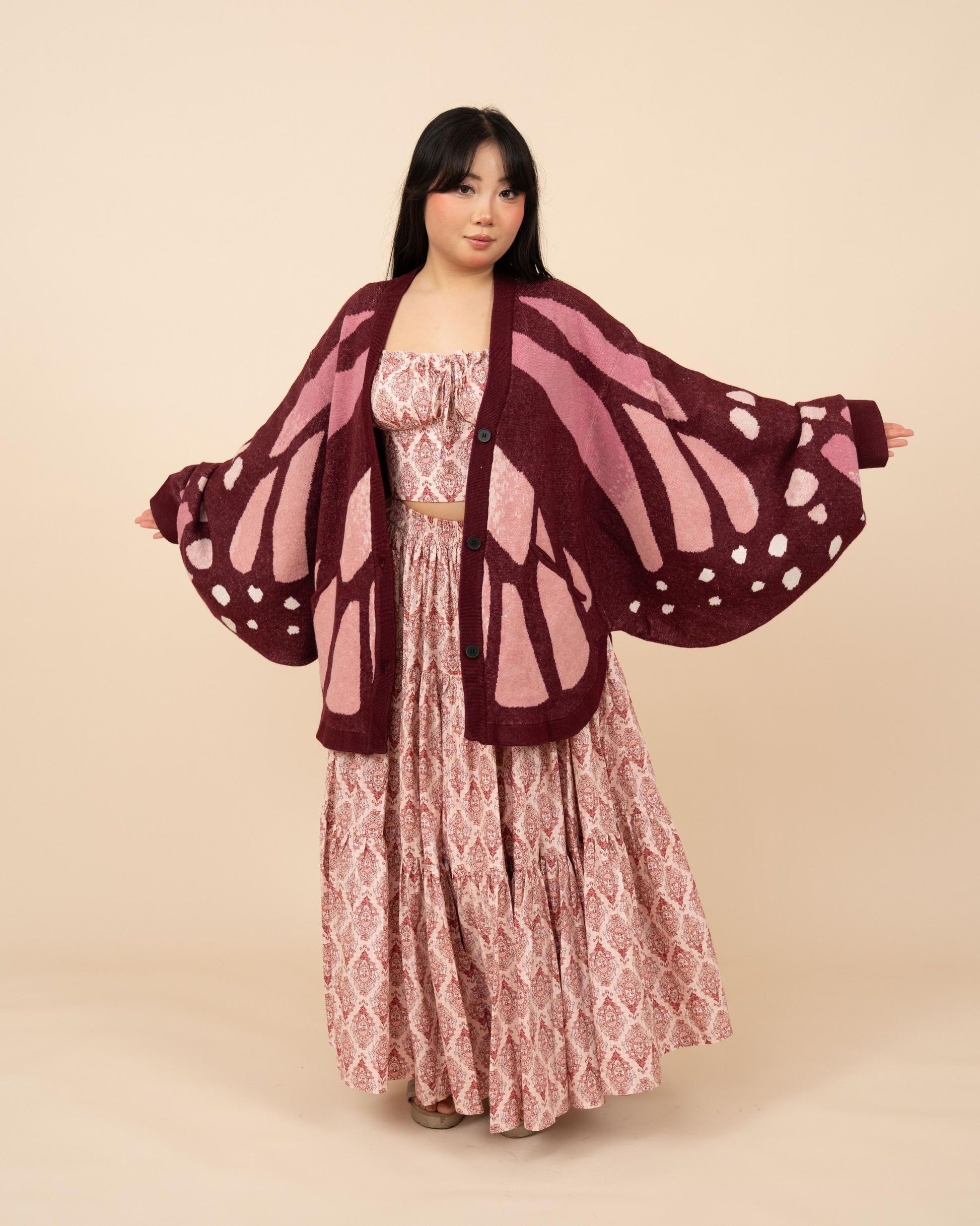 The Monarch cardigan focuses on the butterfly's striking appearance, making it a standout addition to any wardrobe.