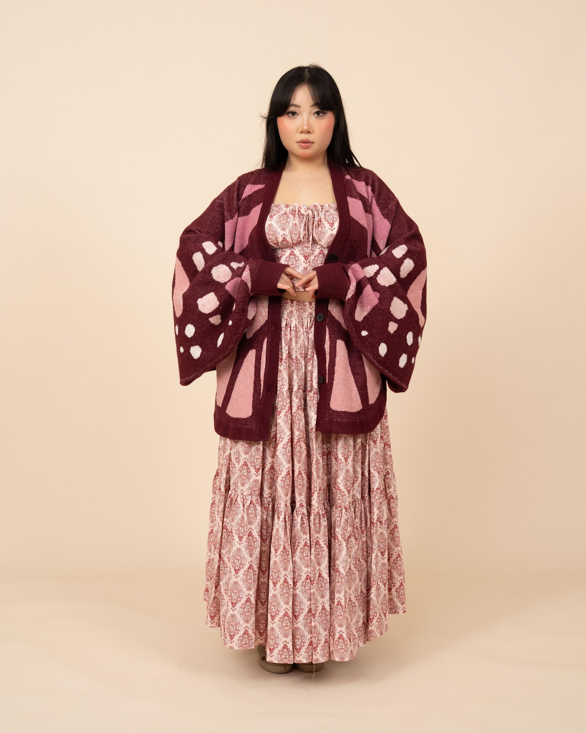The Monarch Cardigan is a beautifully designed piece inspired by the iconic Monarch butterfly, known for its vibrant orange and black wings. This is a pink fantasy take on a traditional Monarch butterfly.