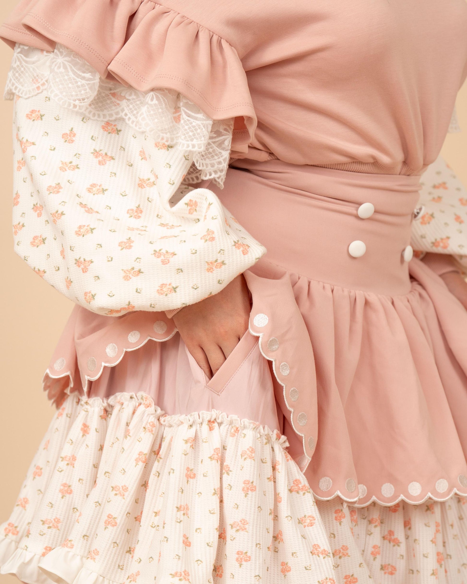 The pink layer of this skirt is made from 75% recycled polyester, 20% viscose, and 5% spandex, while the patterned layer is crafted from 60% polyester, 35% cotton, and 5% spandex. Together, these materials create a smooth, breathable foundation with added durability, gentle structure, and comfortable stretch. The lining is 100% cotton.
