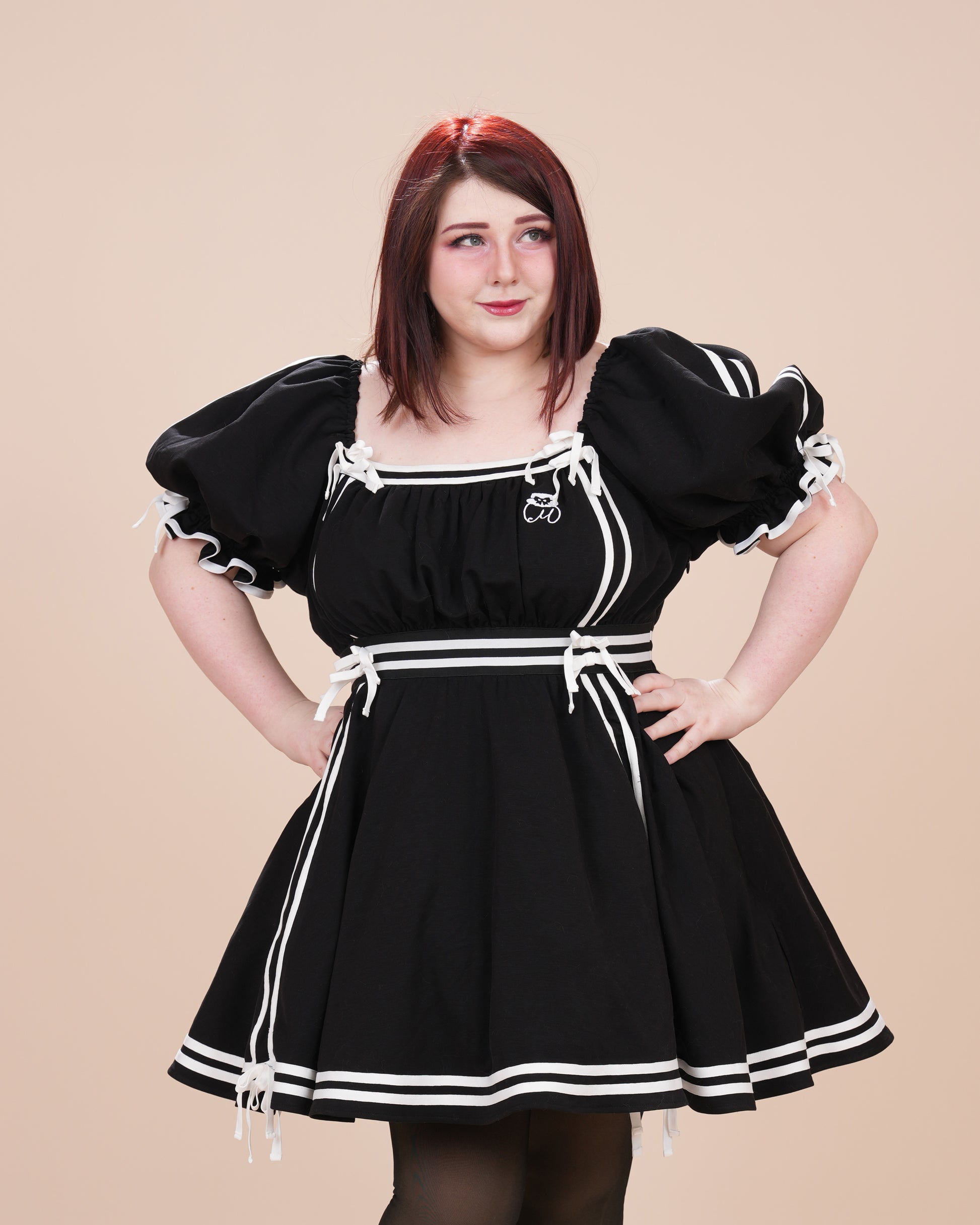 The square neckline frames the collarbone beautifully, while voluminous puff sleeves feature elasticated cuffs designed to comfortably accommodate a wide range of upper arm sizes. The fitted bodice flows into a flared, mid-thigh skirt, enhanced by a built-in organza petticoat that creates a naturally full, hourglass silhouette.
